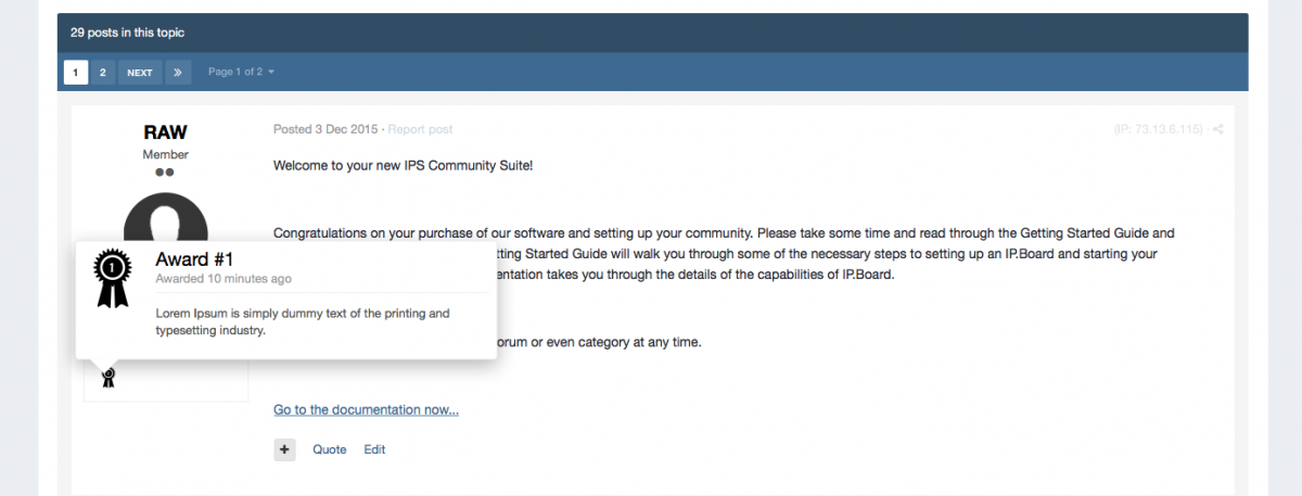 iAwards provides administrators the ability to award their members with badges that show in their profile and, if chosen, on their posts.